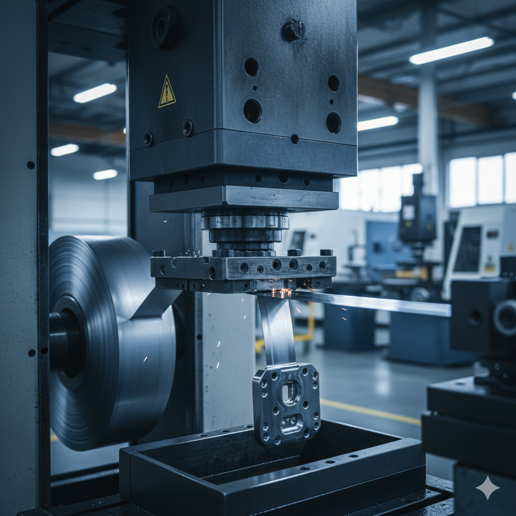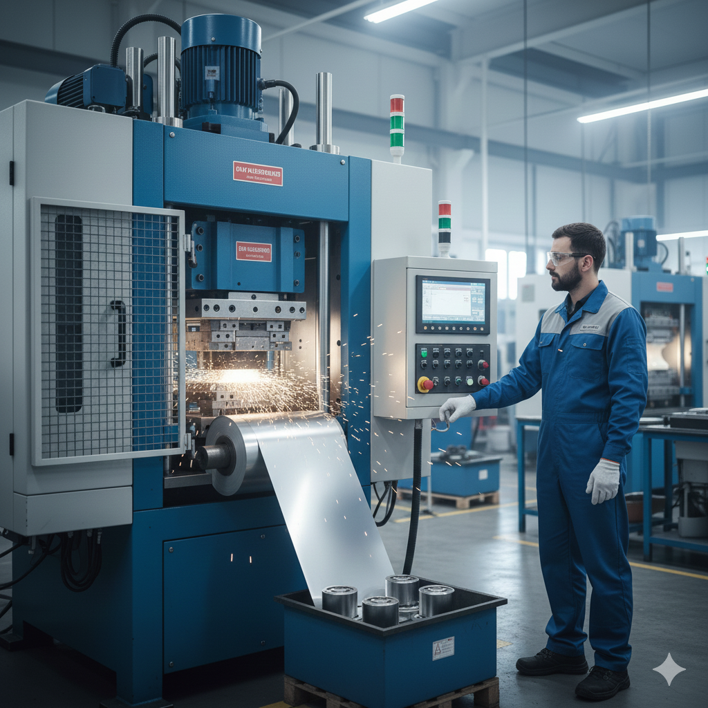 Hidrolik ve eksantrik presler ile metal parçaların seri üretim süreci.